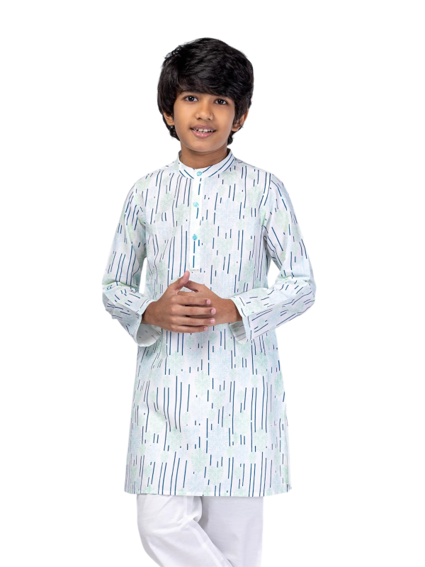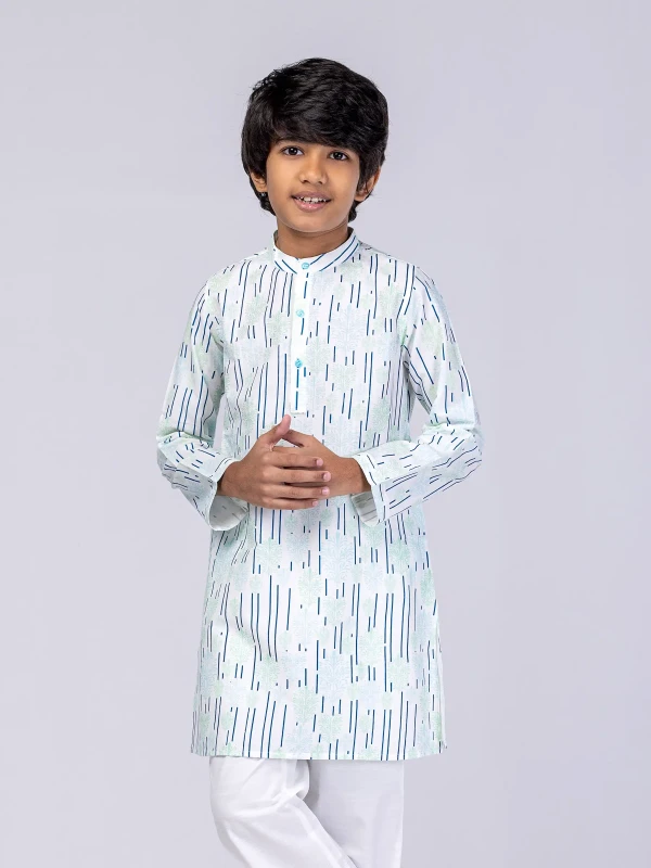 Kids Panjabi - White Printed Vortex-Viscose-Cotton Panjabi