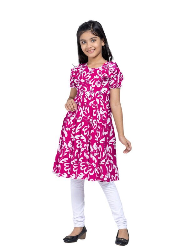 White and fuchsia printed linen frock with white, pink and brown embroidery. Leggings not included with this product.
