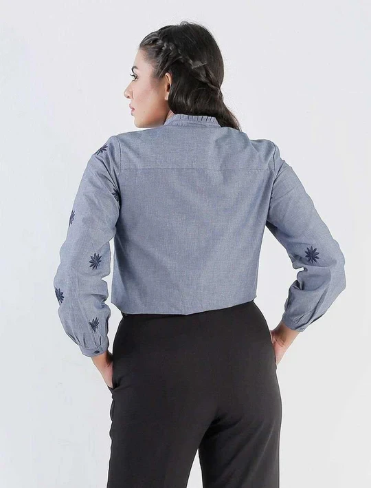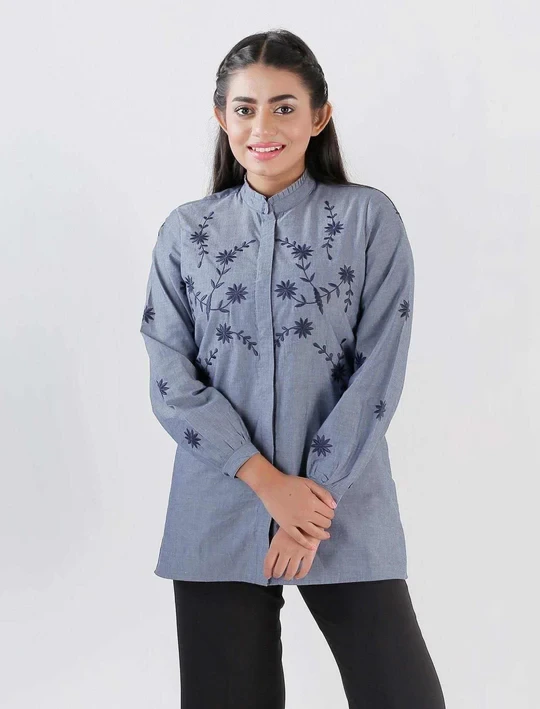 A fantastic choice if you're looking for an embroidered top! This particular top comes with an inner placket and flower embroidery done all over; even the sleeves. It also has a pleated collar. This sophisticated design allows you to have multiple styling possibilities. Anywhere you walk, people are sure to stop and stare.