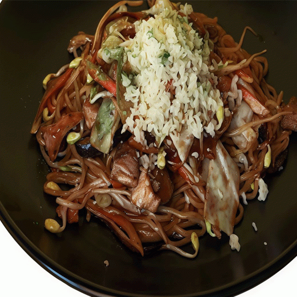•  1:1 - Stir-fried japanese noodles mixed with teriyaki boy chicken strips, fish cake, shiitake mushroom & mixed vegetable topped with crunchy tempura & nori flakes