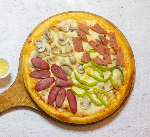 • Consists of bbq chicken pizza (topped with bbq chicken, dice onion & green chili), chicken pepperoni pizza (topped with chicken pepperoni, capsicum & black olive), chicken sausage pizza (topped with chicken sausage, diced onion & tomato), chicken mushroom pizza (topped with chicken mushroom & green chili).