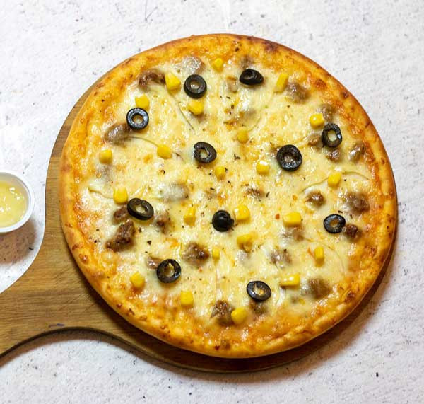 • Topped with julienne cut beef, marinara sauce, sweet corn, black olive & oregano.