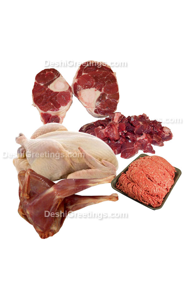 This combo gift include: A) Beef with Bone- 8.88 LB. B) Mutton with Bone- 4.44 LB. C) Chicken-Boiler (Clean) - 2 pc- 6.66LB. D) Roast Chicken - Deshi (Clean without skin) - 2 pc- 3.33 LB and E) Ground Beef Kima- 2.22 LB.