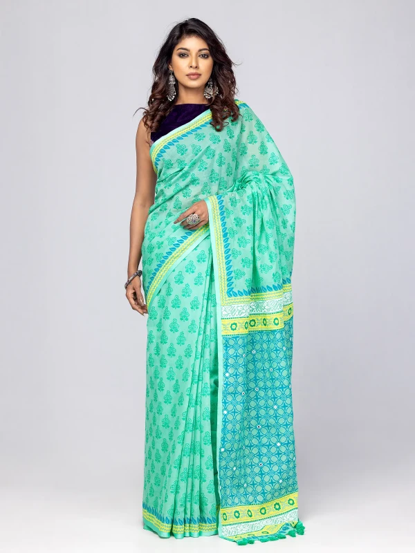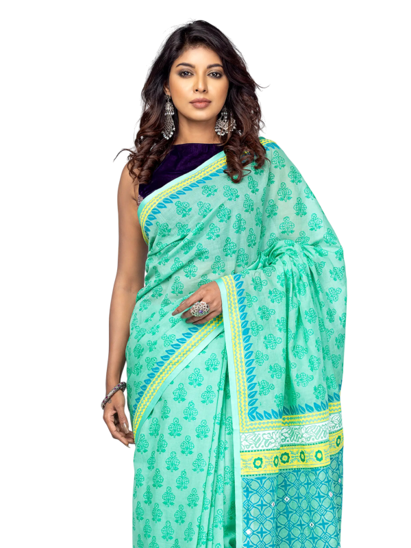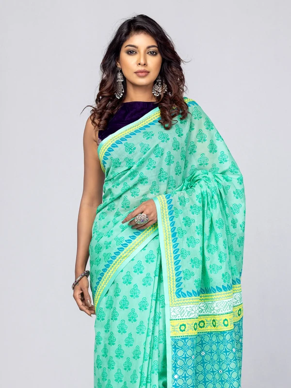Mint green cotton saree with green, blue and yellow prints. Comes with matching unstitched blouse piece. Blouse shown in the photo is a styling suggestion, it is not a part of the actual product.