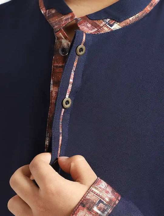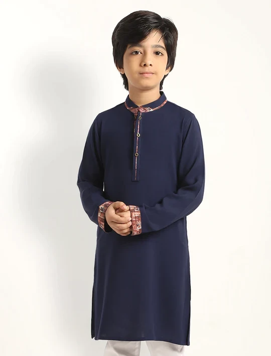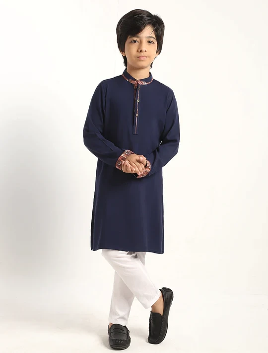 Introducing our latest Kid’s Panjabi! Made from premium quality fabric, our Kid’s Panjabi is both comfortable and breathable, ensuring that little one stays cool and comfortable, no matter the occasion. The contrast button is beautifully embellished on the placket. It is a cut and sew Panjabi where contrast fabric can be seen on sleeve hem, collar, and placket which add as element of elegance and charm to the outfit. Order this now and watch your little one shine in our stunning Kids Panjabi!