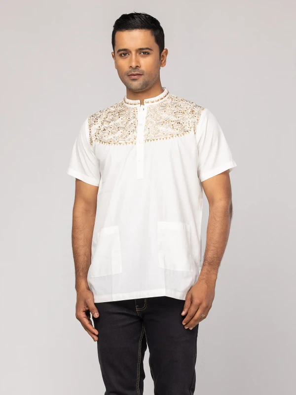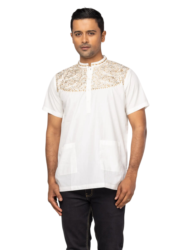 White cotton fatua with off white and brown embroidery. Features two pockets.