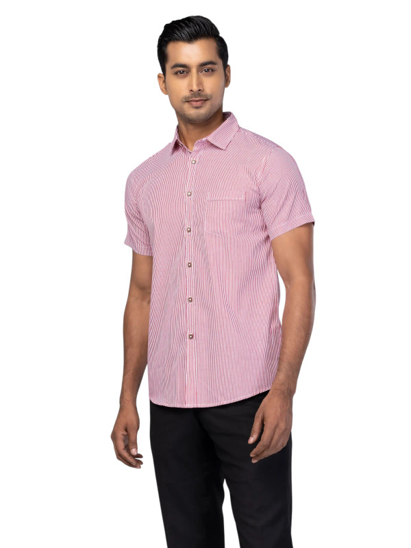 Casual Half Sleeve - White/Red Striped Cotton Fitted Shirt For Men