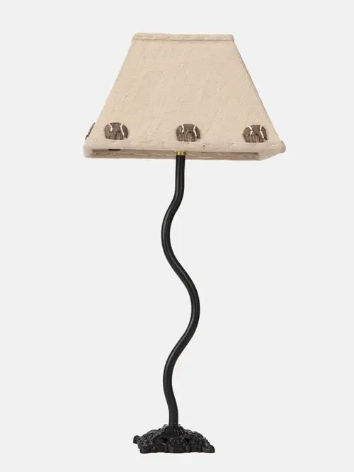 Black wrought iron zigzag shaped lamp base with engraving.