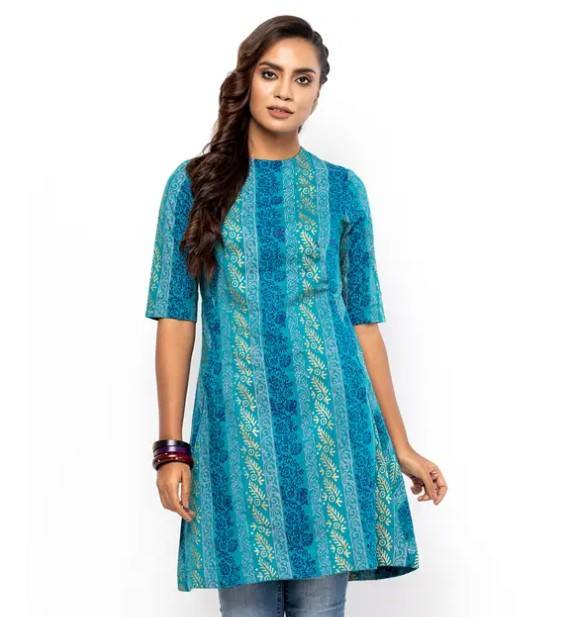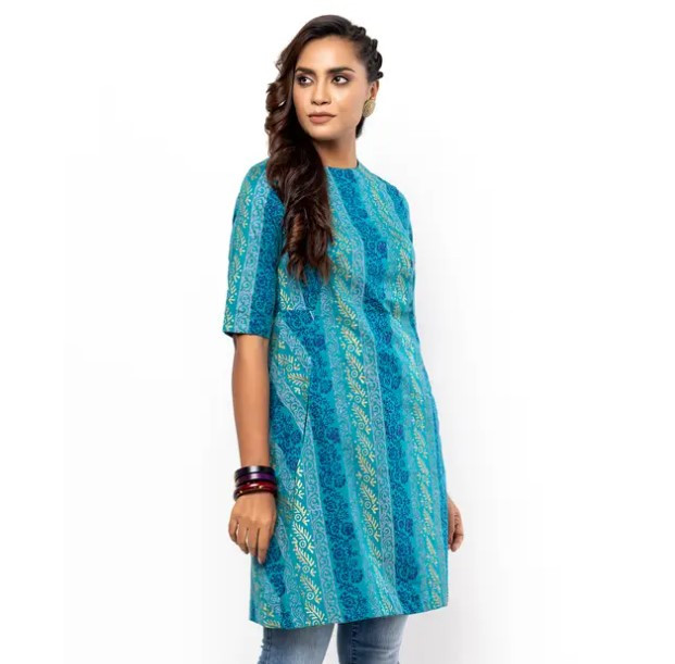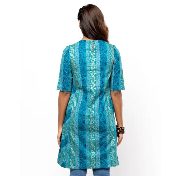 The Taaga Top features a modern silhouette with a round neckline and three-quarter sleeves, offering a flattering fit for various body types. The blue prints, inspired by nature and contemporary design, create an eye-catching visual appeal. Whether paired with jeans for a laid-back day out or dressed up with accessories for a stylish evening, this top effortlessly combines comfort with fashion-forward aesthetics.