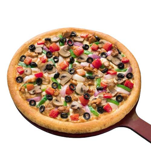 • Topped with spicy chicken, tomatoes, onions, capsicum, mushrooms & black olives.