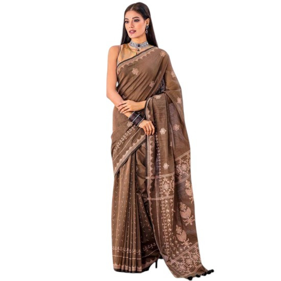 Silk Sharee - Coffee color printed & embroidered Cotton Silk Sharee