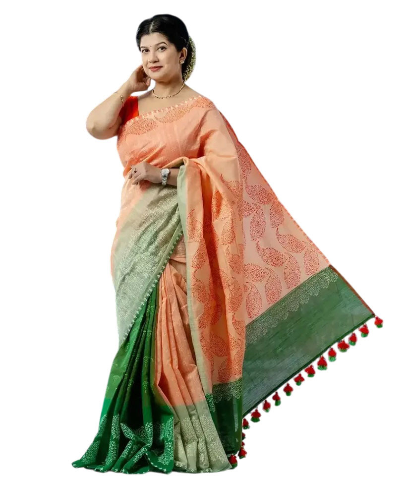 Women's Sharee - Slub-cotton women’s sharee features block-print & handwork.
