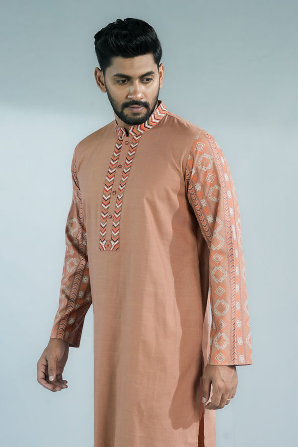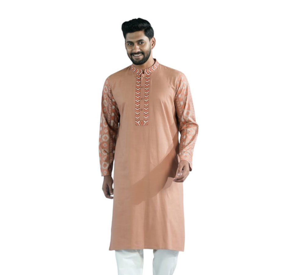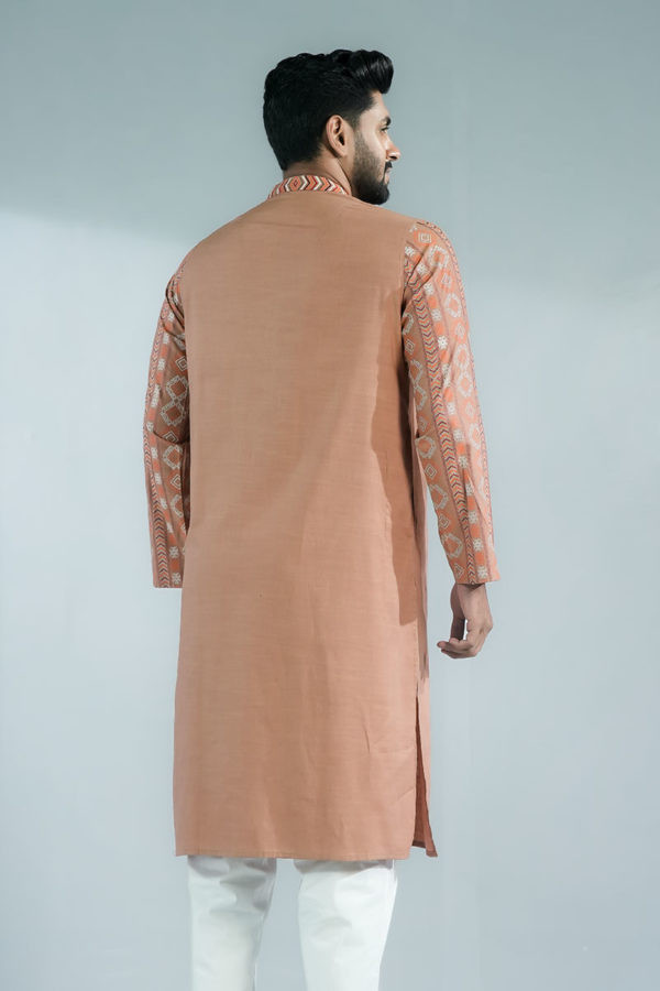 Long Panjabi - Dusty Sand Coloured Cotton Printed & Embroidered Panjabi