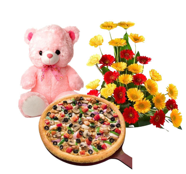 Flowers & Pizza With Teddy Bear