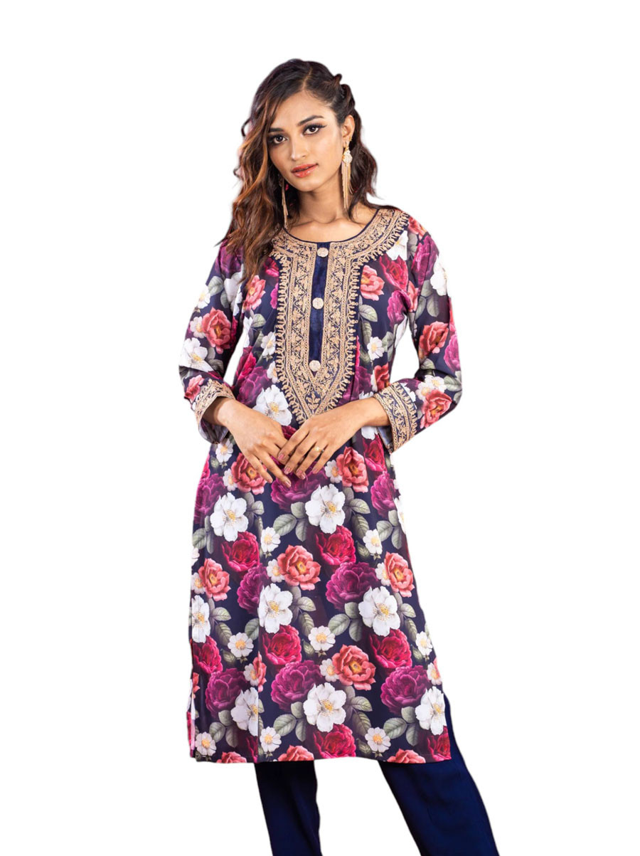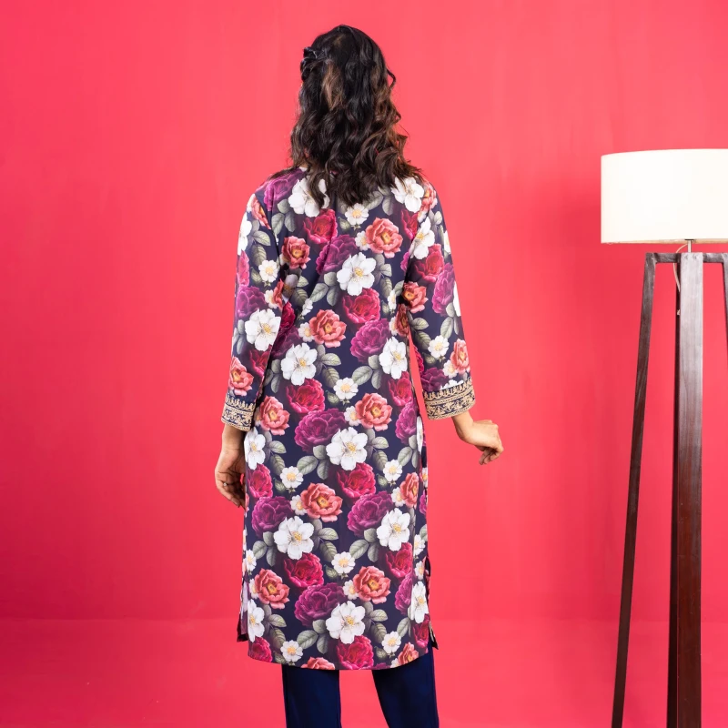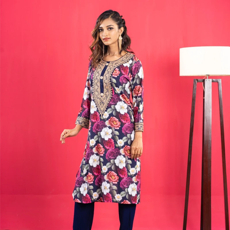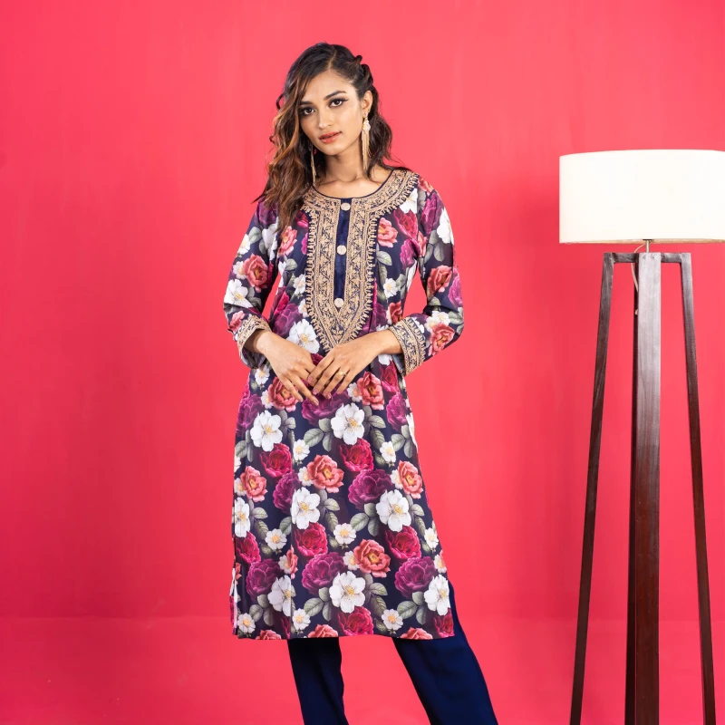An Elegant Kurti Made Of Silk Fabric, Decorated With Karchupi Work And Digital Printing In A Vibrant, Multi-Color Palette. Perfect For Special Occasions And Sure To Make A Statement Wherever You Go.
