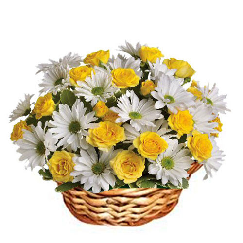 Beautiful 15 White Zerbera, 15 Yallow Thai Roses & with green stuffs in a basket.