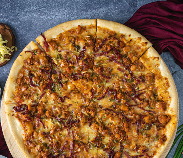 • Topped with barbequed chicken cubes mixed with white & spicy naga sauce, mozzarella, cheddar cheese & crispy bacon bits.