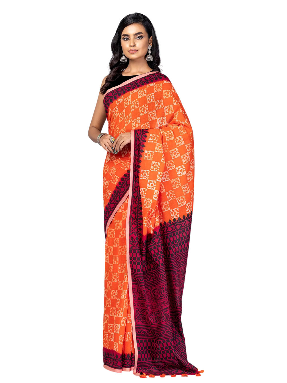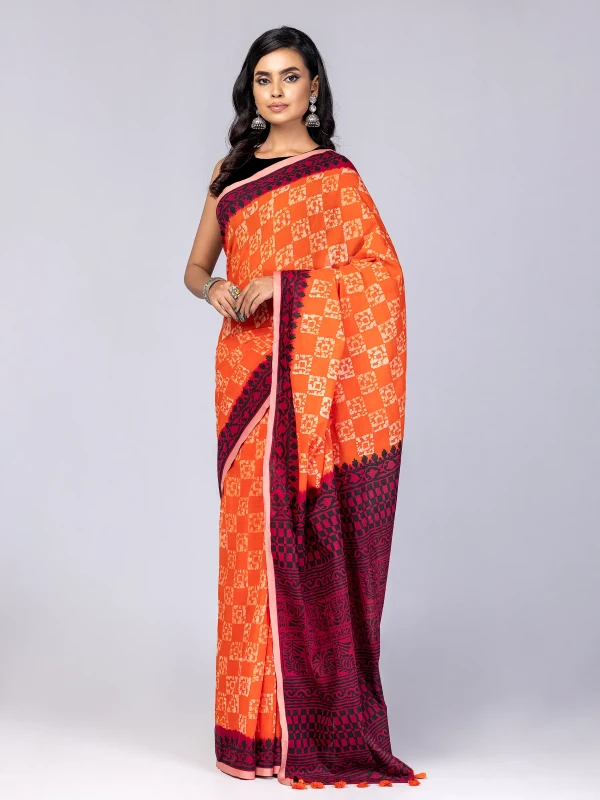 Sharee - Orange Wax Dyed and Printed Cotton Sharee