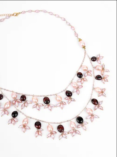 Adorn yourself with exquisite charm in our Pearl & Stone Necklace. Delicate pink pearls gracefully intertwine with a golden-colored chain, accentuated by the allure of brown acrylic stones. This necklace exudes elegance, adding a touch of sophistication to any ensemble.