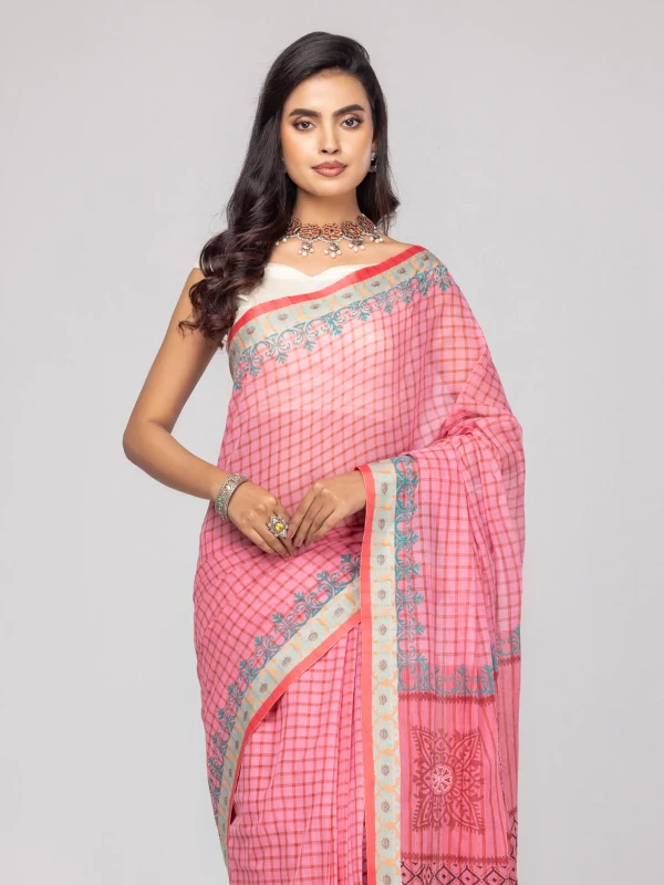 Pink check cotton saree with green and black prints. Features white embroidery. Comes with matching unstitched blouse piece attached at the end of saree. Blouse shown in the photo is a styling suggestion, it is not a part of the actual product.