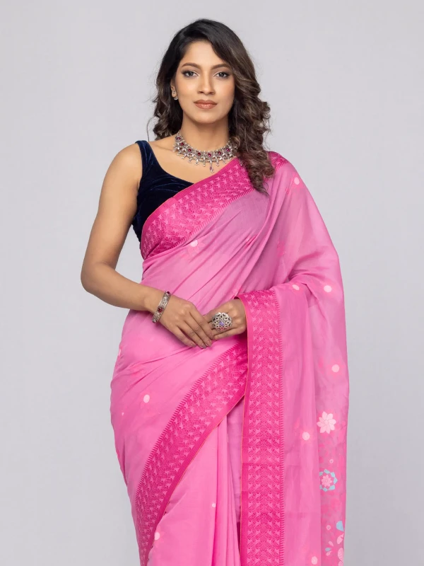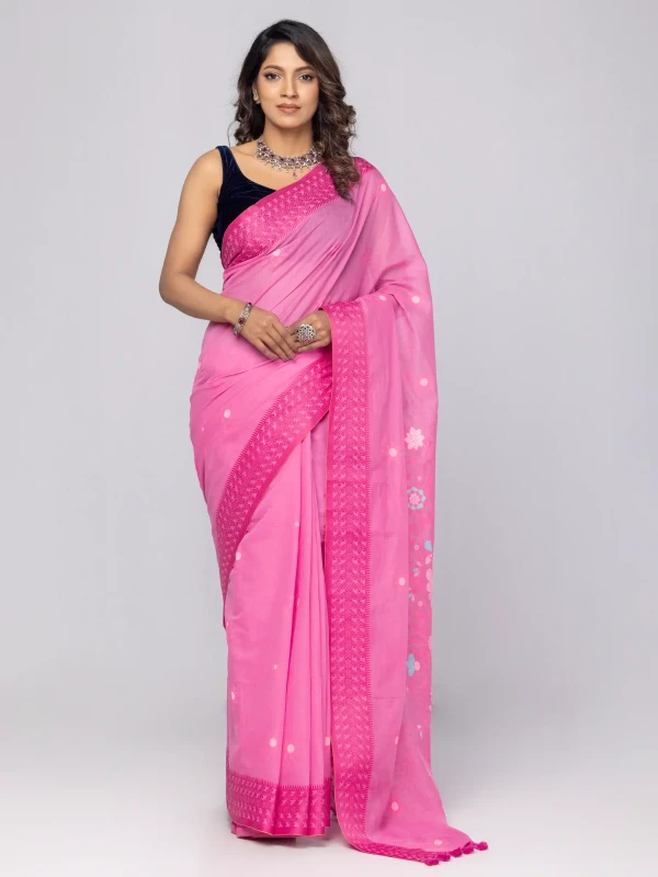 Pink cotton saree with dark and light pink prints. Comes with matching unstitched blouse piece attached at the end of saree. Blouse shown in the photo is a styling suggestion, it is not a part of the actual product.