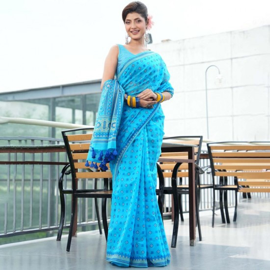 Teal blue color printed & embroidered cotton shari with Teal blue color printed blouse piece.