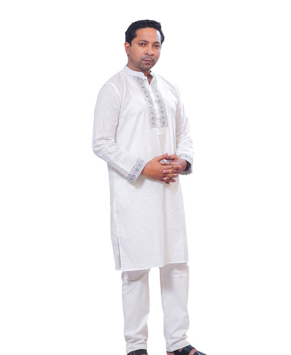 Short Panjabi -Fashionably Embroidered White Cotton Panjabi
