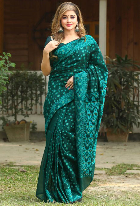 Embrace the elegance of traditional craftsmanship with our Silk Jamdani Sharee. This exquisite piece is a testament to the timeless art of Jamdani weaving, a heritage craft that has been cherished for centuries. Made from the finest silk, this sharee flaunts a delicate, intricately woven pattern that exudes sophistication and grace.